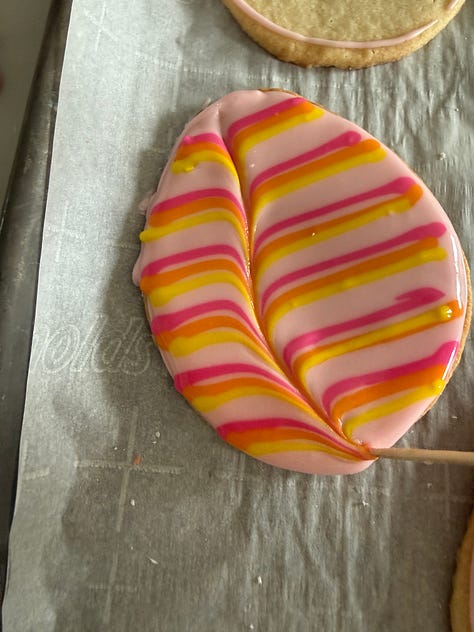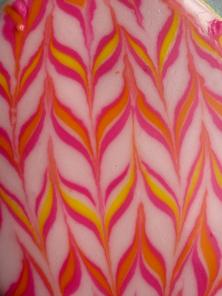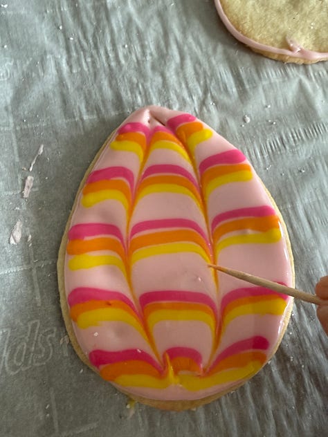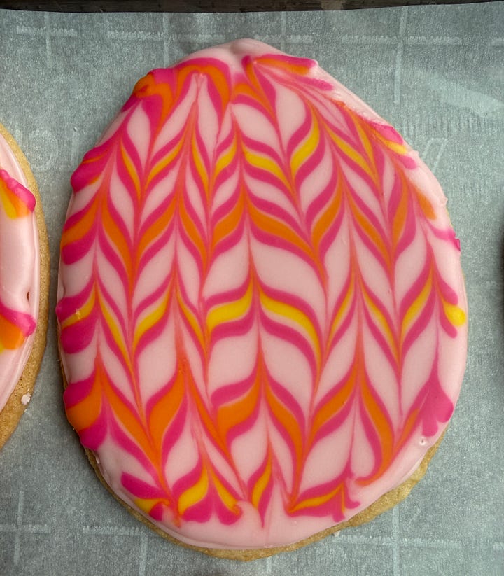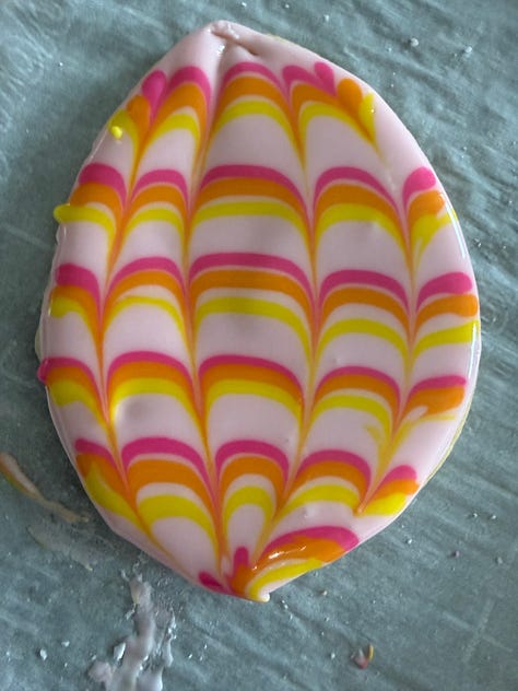 Using the background color, fill in the frosting within the outline. You want to use just enough the cover the cookie without it overflowing. If needed, you can lightly spread the icing using a small spatula. Immediately, pipe stripes with the other colors across the cookie. Use a toothpick in a downward, then upward movement across the cookie to marbleize the design. Wipe the toothpick off between use. Repeat with each cookie individually, varying the placement of the stripes to create different designs.