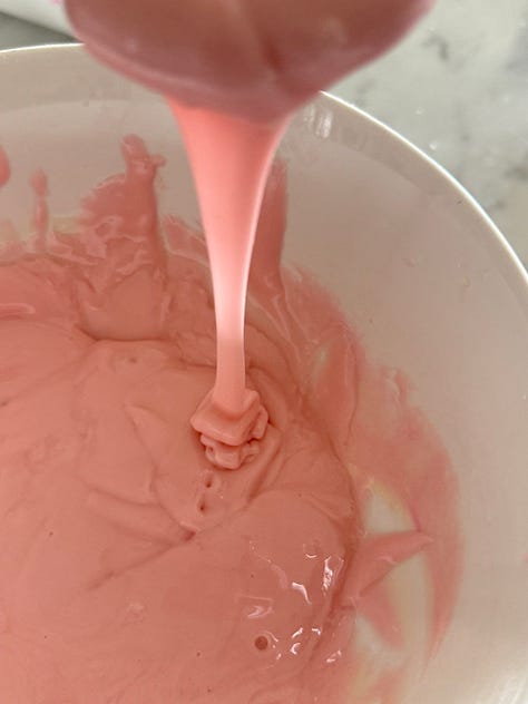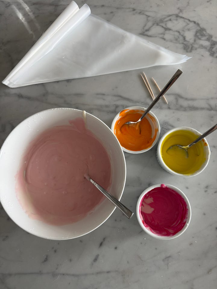 The icing will need to be divided to color it. Place about a half cup of icing each in three small bowls for the stripes. The remaining icing will used for the background color.