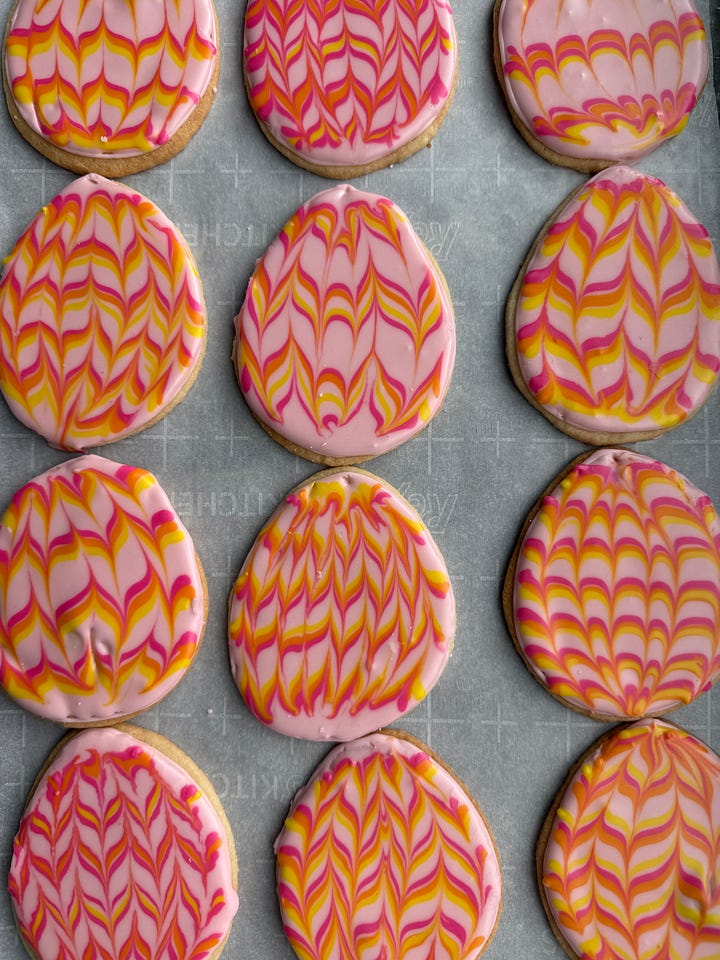Decorated sugar cookies were the most popular item at my bakery, especially around holidays. They are also the item people find hardest to make on their own. Decorating cookies with royal icing takes a little practice and patience, but the results are worth it. These marbleized easter egg cookies are pretty and impressive, but fairly simple to decorate. They would make a great addition to an Easter dessert table or bagged individually for Easter baskets.
