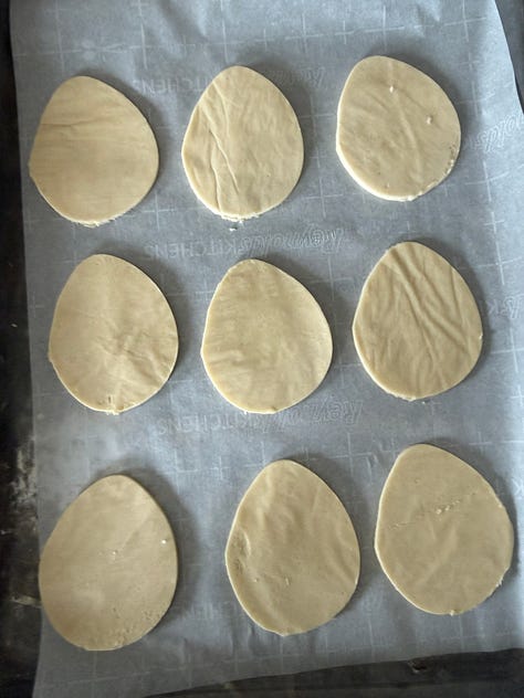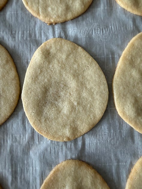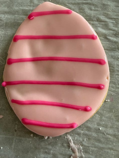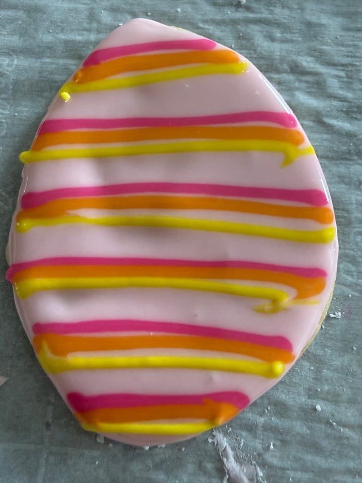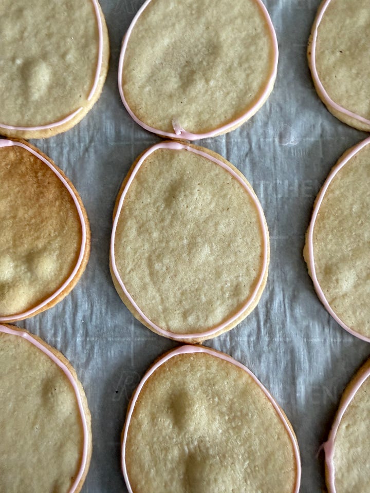 Roll out the sugar cookie dough to 1/8” thick and cut out the cookies with an easter egg cookie cutter. Bake and cool.