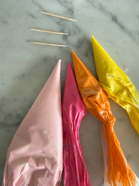 Then, you will decorate each cookie individually. Gather your 4 piping bags, small spatula, toothpicks and a paper towel to wipe the end of the toothpick after each use.