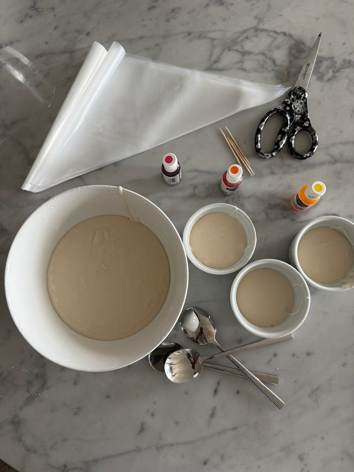 food coloring: 3-4 colors ( I like the thicker gel kind available where cake decorating supplies are sold)