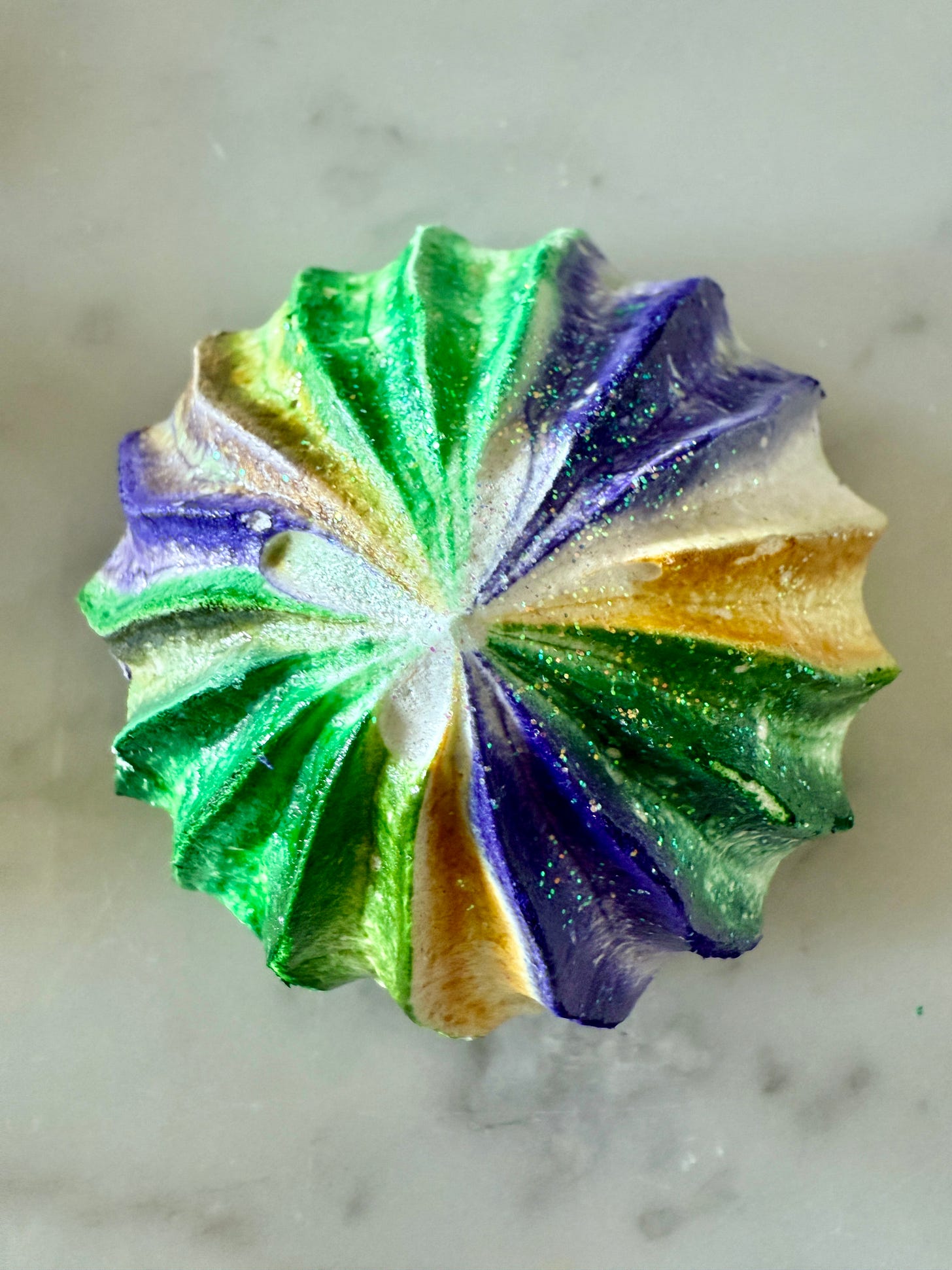These pretty little meringues are like a king cake in a bite. These are a fun and elegant alternative to endless king cakes as Mardi Gras gets closer Painting the pastry bags may take a little practice and it’s best to start light. I generally use two or three pastry bags to keep the colors fresh.